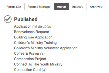- Published: A Form is considered published if its start date has passed but its stop date has not (if it has one).