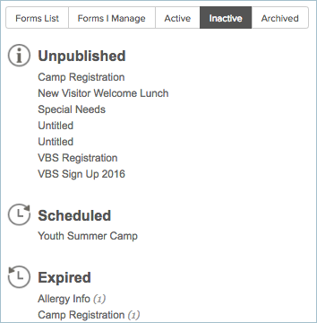Forms that are Unpublished, Scheduled or Expired will appear in the Inactive section to those with Forms admin privileges.